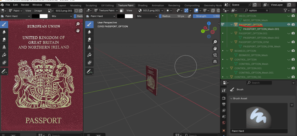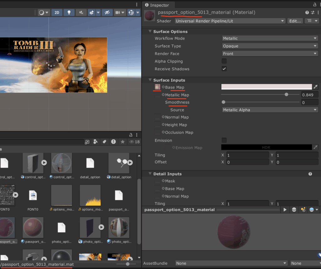 Let’s take care of our meshes. As we mentioned earlier, since we decided to use the OBJ format, after importing our objects into Unity, we need to “combine” them with textures. To do this, we need to create a material, use the appropriate texture as Base Map and experiment with the Base Map colour and Metallic Map and Smoothness. For example, this is my interpretation of the passport material 😀