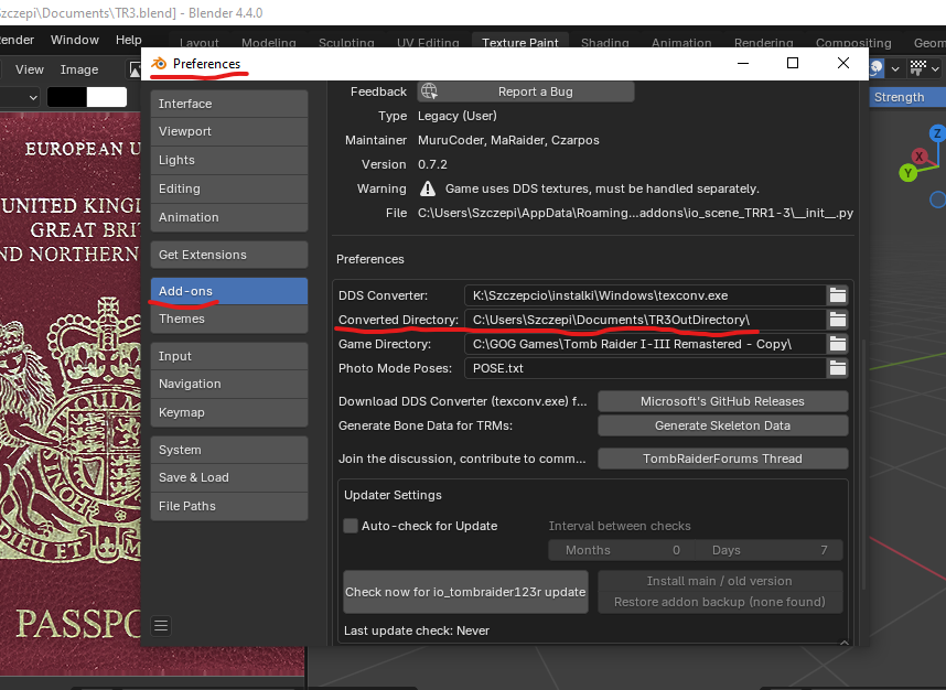 Since it is relatively easy to extract visual and audio elements from the remastered series, we will need “Tomb Raider I-III Remastered” (can be bought on gog.com) and Blender with TR123R-Blender-Addon. Blender and the addon are required to extract the original meshes and textures.