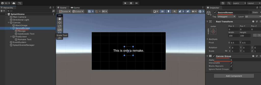 Since every great production starts with splash screens, let’s not be different and do the same. Thus, let’s create a new scene (SplashScene) and add a black empty image as the background. We will show one text and another text with a picture sequentially. To do this, we will utilise Canvas Group and its Alpha property.
