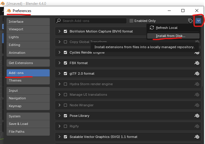 Now, let’s move to Blender and the addon. To install TR123R-Blender-Addon, download the zip file, open Blender, navigate to Edit -> Preferences ->Add-ons, click “Install from Disk” and select the zip file. Then configure it as README.md states.